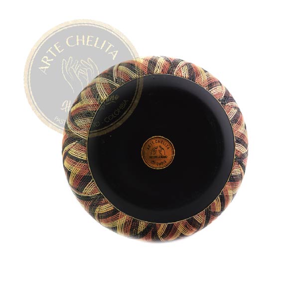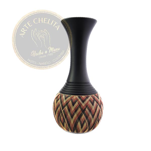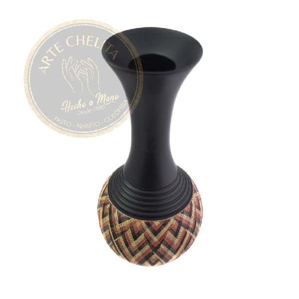 Jarrón en madera con enchape y tetera, en colores llamativos y fondo negro, disponible en las dimensiones de: 25 cm, 35 cm y 45 cm.